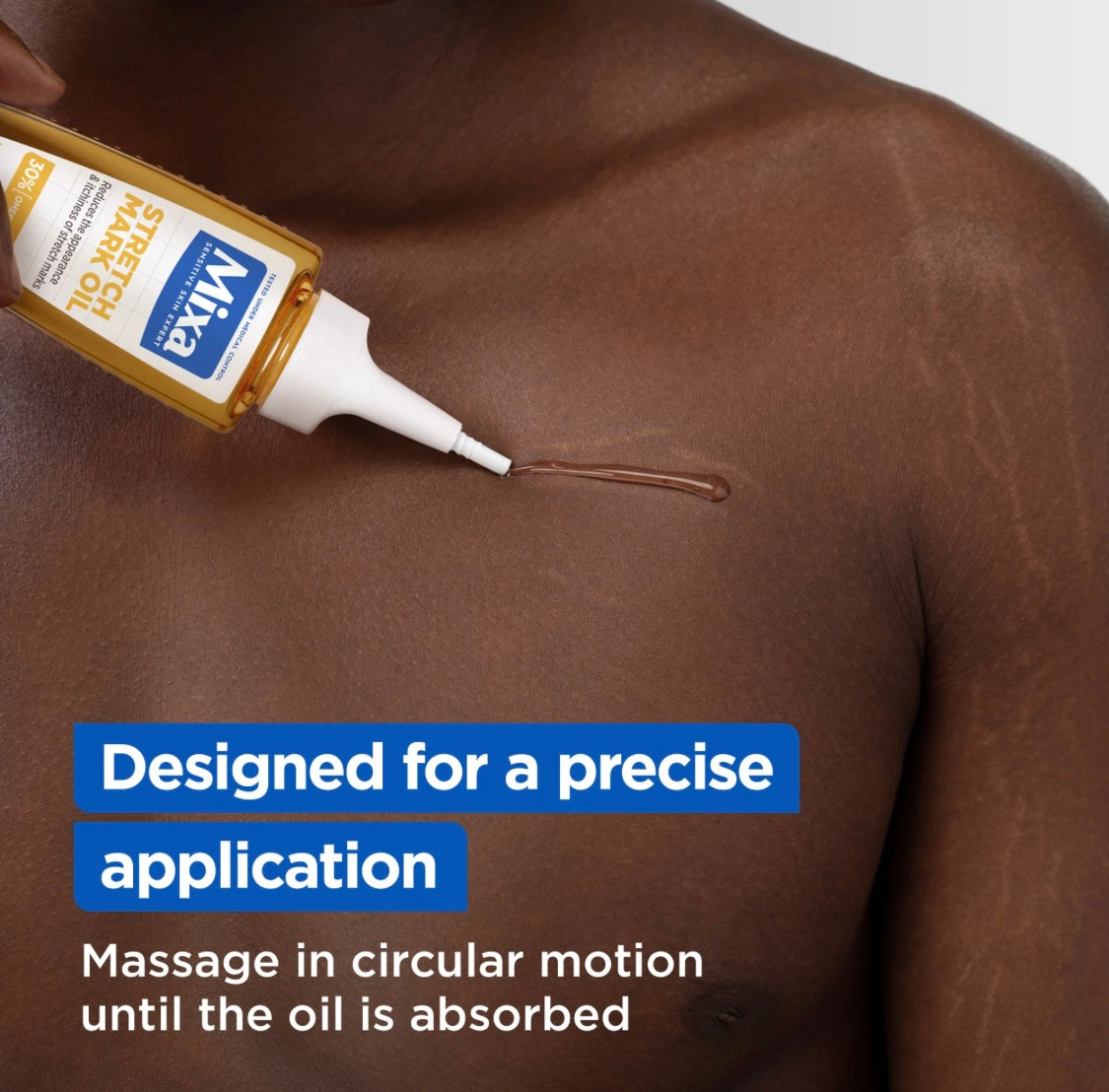 Apply daily to clean, dry skin in gentle circular motions until the oil is fully absorbed. Focus on areas prone to stretch marks. For post‑pregnancy use on the breasts, wash the area before breastfeeding and avoid cracked skin.